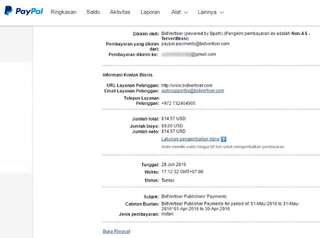 Nah, itu saja yang dapat saya informasikan mengenai bukti pembayaran dari Bidvertiser. guna memperoleh penghasilan dari blog atau website yang kalian miliki. Dan bidvertiser adalah cara terbaik menghasilkan uang selain adsense, infolinks, chitika ataupun yang lainnya sebab cara mendaftarnya sangat mudah dan pasti diterima. Semoga bermanfaat dan silahkan dibagikan jika kalian anggap artikel ini juga bermanfaat. Salam sukses di internet.