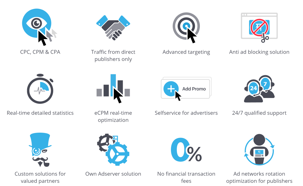 Saat ini, mereka berfokus untuk menghubungkan penerbit yang tepat secara langsung dengan pengiklan berbayar terbaik melalui format iklan yang paling efektif seperti popunders, spanduk display, iklan dalam-video, iklan pushup, tautan langsung, dan pesan instan. Terlepas dari kenyataan bahwa popunders adalah format iklan terkuat, HilltopAds bekerja dalam memberikan lalu lintas ke sebagian besar iklan konversi dan memberikan bantuan kepada Manajer Pribadi internasional mereka yang berpengalaman.